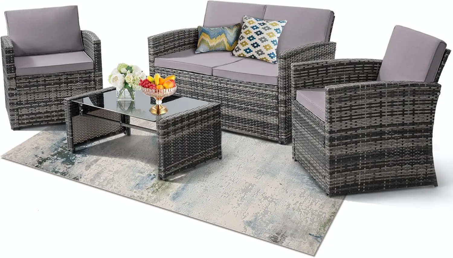 - 【EASY TO CLEAN】Our outdoor four-piece set comes with a coffee table with a detachable tempered glass top, which is held in place by suction cups; You can put liquids like champagne on it and don’t worry about overturning it, as a glass tabletop can be restored with a simple wipe
