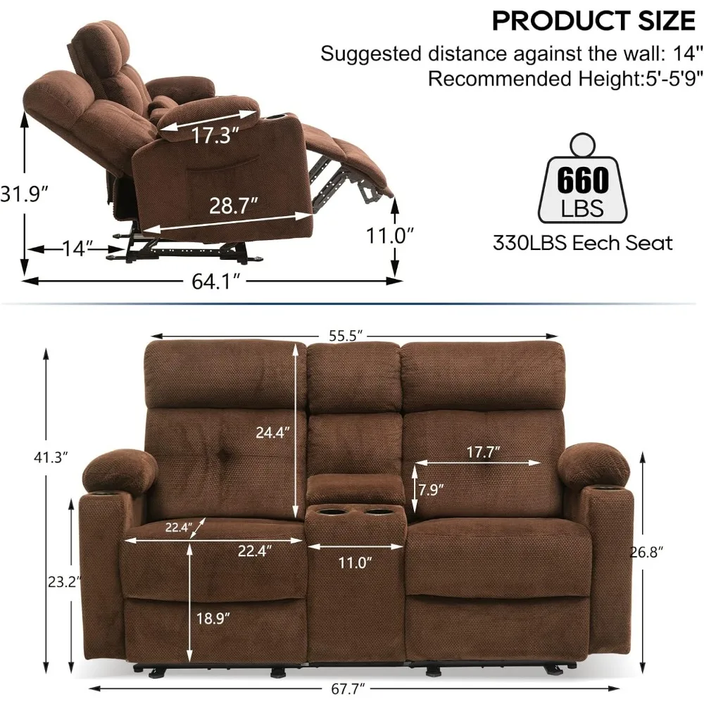 68” RV Loveseat Recliner with Console, Double Recliner Loveseat with Heat and Massage, RV Wall Hugger Love Seat Recliner Sofa,