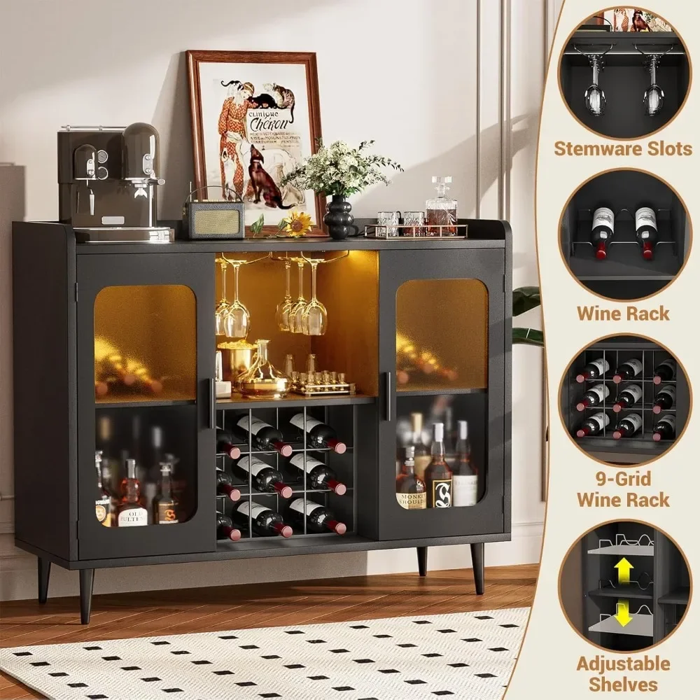 - 【𝐁𝐚𝐫 𝐂𝐚𝐛𝐢𝐧𝐞𝐭 𝐰𝐢𝐭𝐡 𝐑𝐆𝐁 𝐋𝐄𝐃 𝐋𝐢𝐠𝐡𝐭】 The freestanding liquor cabinet come with smart LED light strips, which features over 60000 colors and multiple flashing modes via APP or remote control for you to choose. With Led music sync function and built-in sensitivity adjustable mic, the color of led light will change with the rhythm of the sound and music. This wine cabinet can bring many surprises to your party.