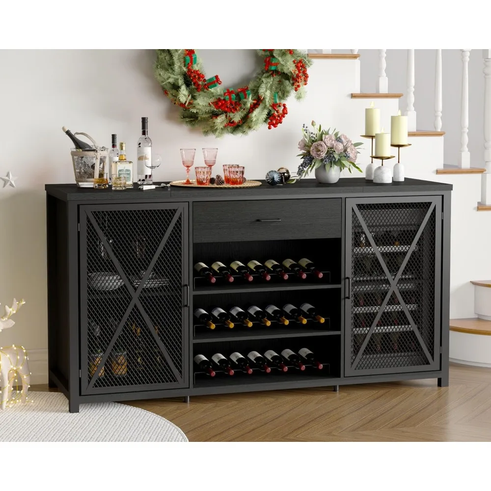 - Ingenious Space Layout: Crafted from three delicately joined panels, this modern black liquor cabinet includes drawers, wine racks, glass holders, detachable back panels, adjustable shelves, fridge storage space, lever, and two iron mesh doors. This design ensures that you can neatly organize all your items with convenience. The well-organized storage space creates a tidy environment for your home, kitchen, or living room, alleviating the frustration of clutter.