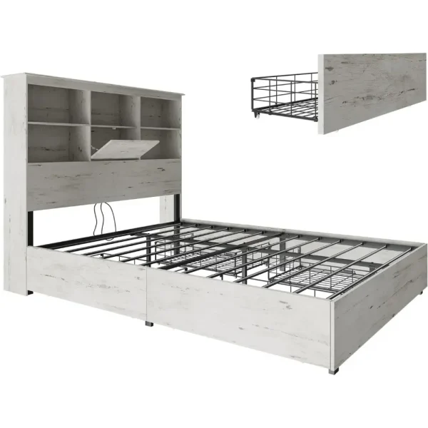 - AMPLE STORAGE: 51.2″ LED Bookcase headboard provides 5 open storage spaces, 2 adjustable shelves & a hidden storage area, creating flexible storage options. 4 under bed storage drawers is perfect for clothing.
